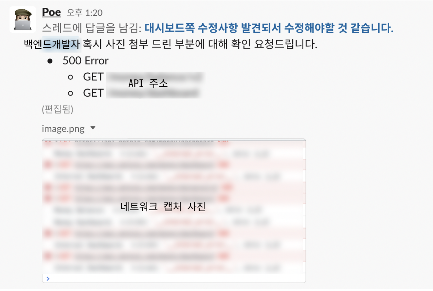 저같은 경우는 재현스탭과 해당 네트워크 에러를 캡처해서 에러에 대한 최대한 많은 정보를 전달해줍니다.