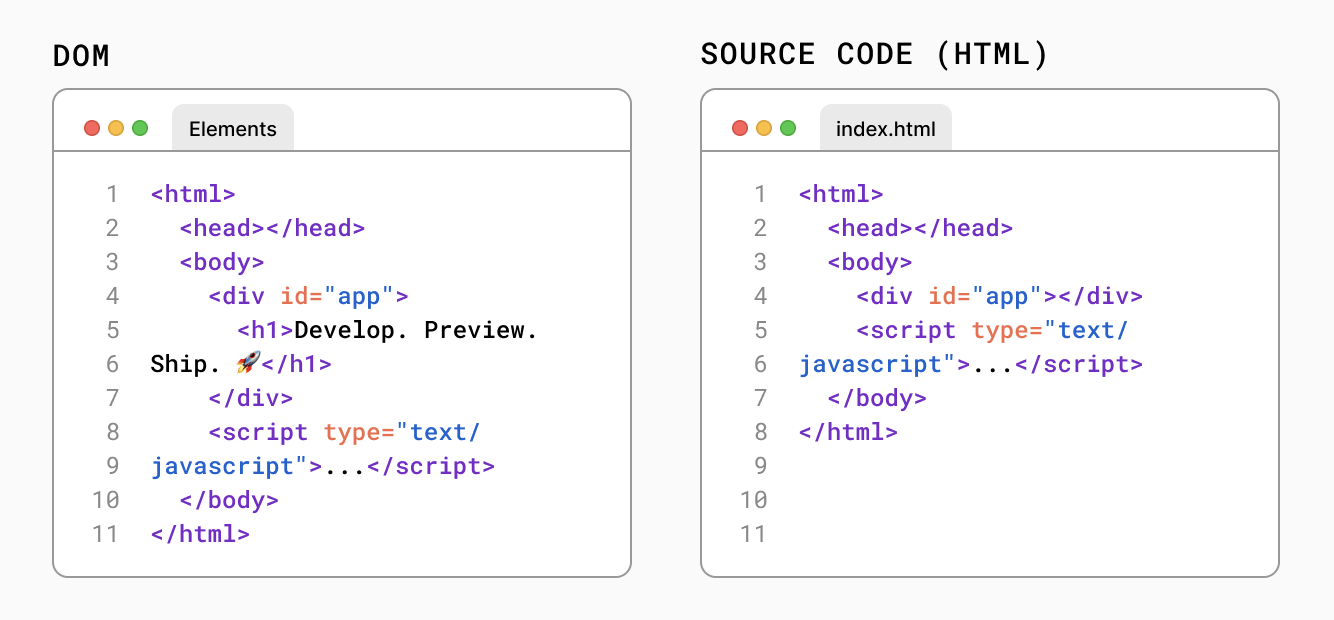 페이지의 DOM은 소스 코드로 사용자가 만든 원본 HTML 파일과 다르다는 것을 알 수 있다.