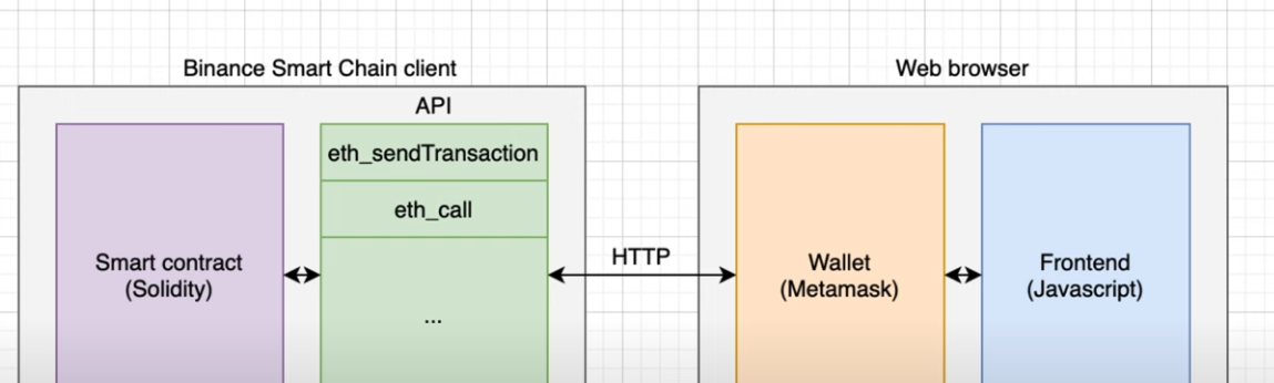 바이낸스 스마트 체인의 api에 도달할 때까지 인터넷은 요청을 실행할 evm 또는 이더리움 가상 머신으로 보내지고 마지막으로 응답을 다시 보냅니다. 프론트엔드 또 다른 매우 중요한 부분은 프론트엔드에 있는 사용자의 지갑입니다.