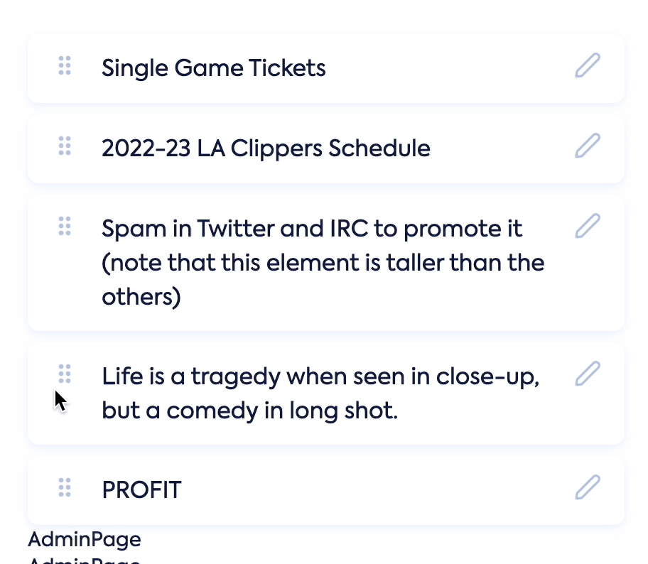 `{/* <DragDrop setCards={setDragDropList}> {dragDropList.map((item, idx) => ( <DragDrop.Item key={idx} {...item} onClick={changeEdit} /> ))} </DragDrop> */}`